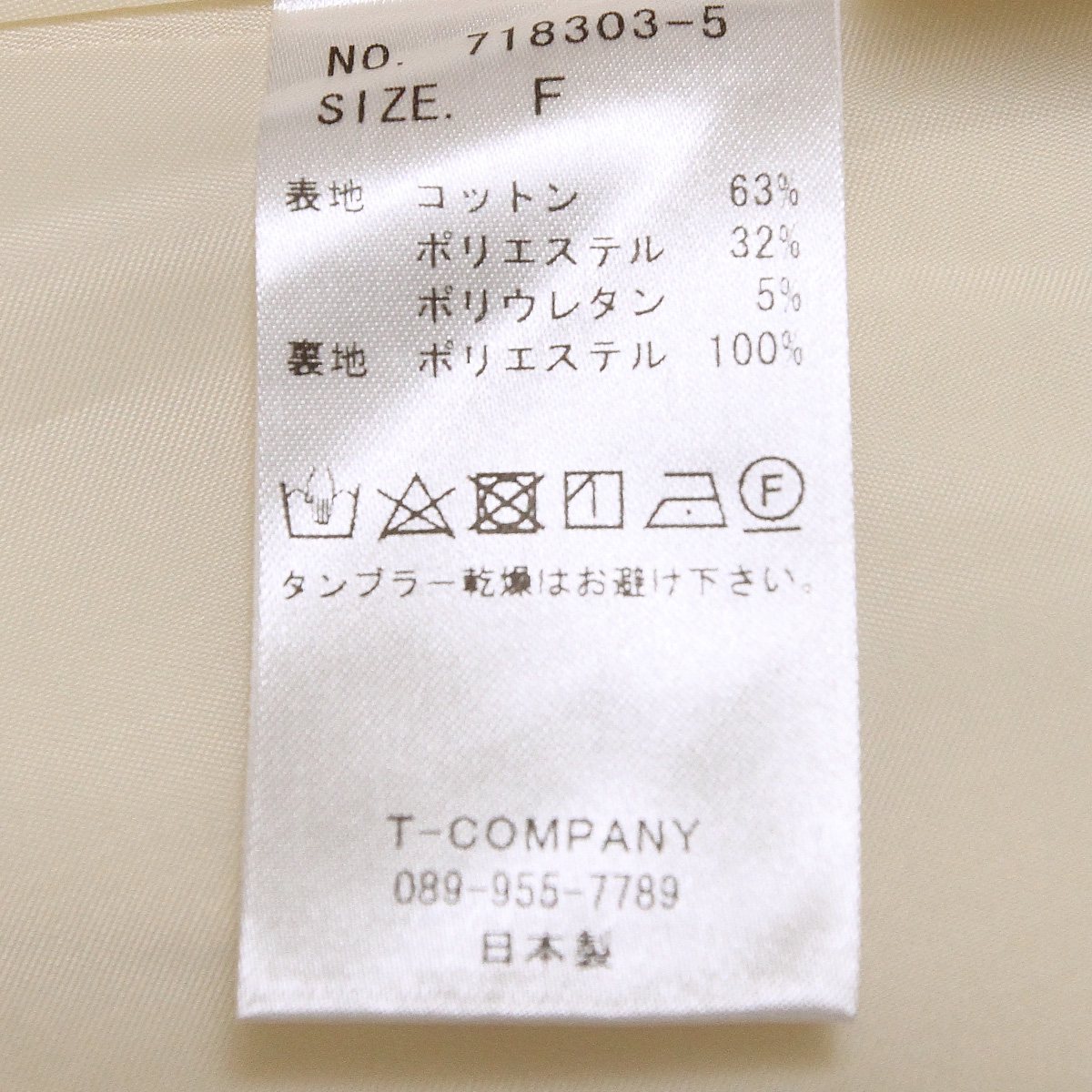 表地:コットン 63%、ポリエステル 32%、ポリウレタン 5%