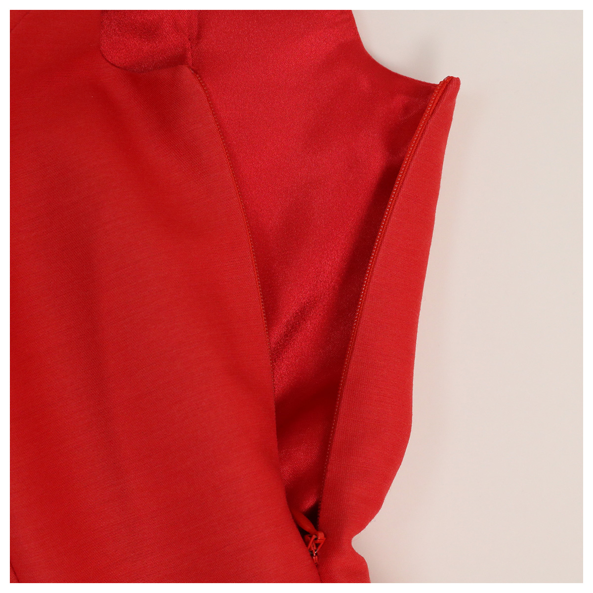 着脱:サイドファスナー約17cm、バック襟元スリット約9cm・ボタン