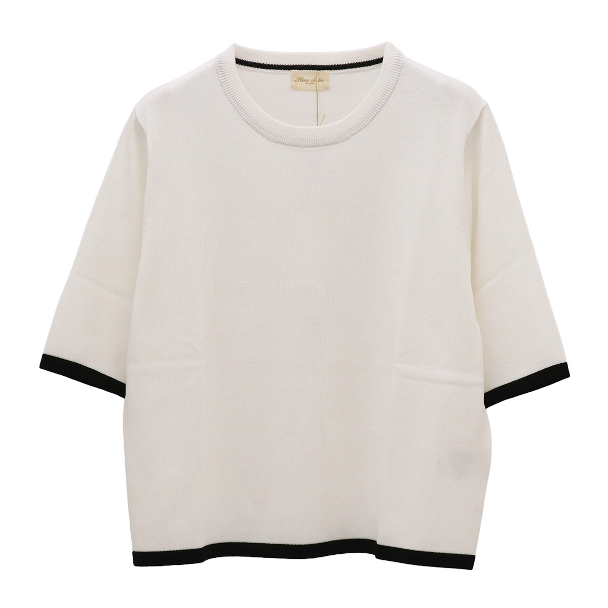 ショート丈クルーネック5分袖配色ニットトップス 01×19 ホワイト×ブラック【Fleur de lis(フラデリ)】