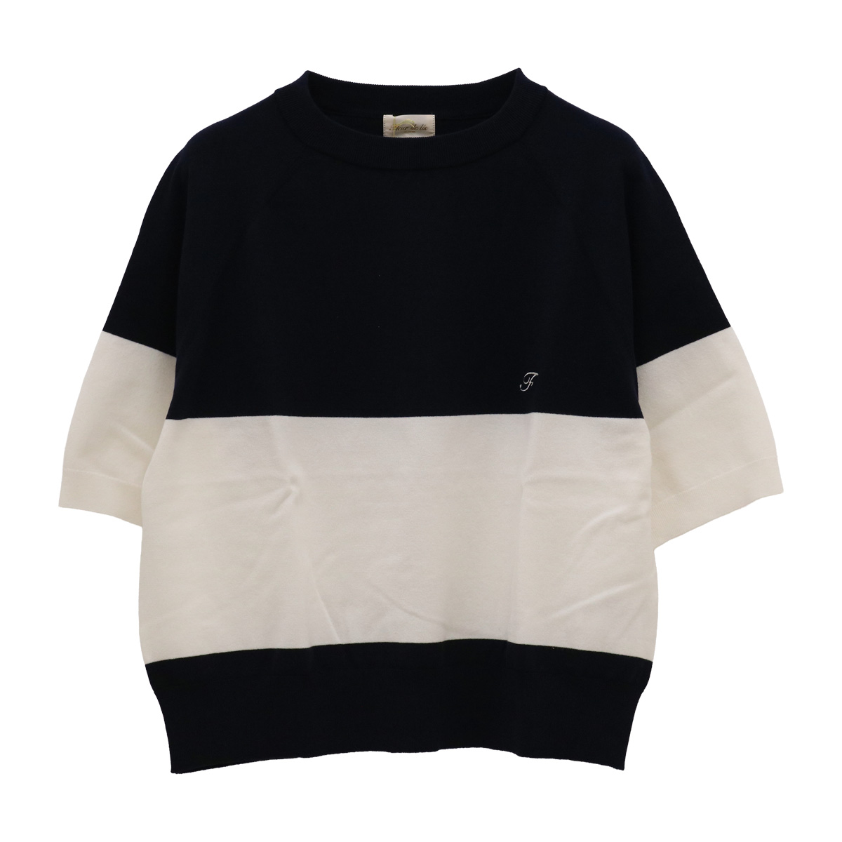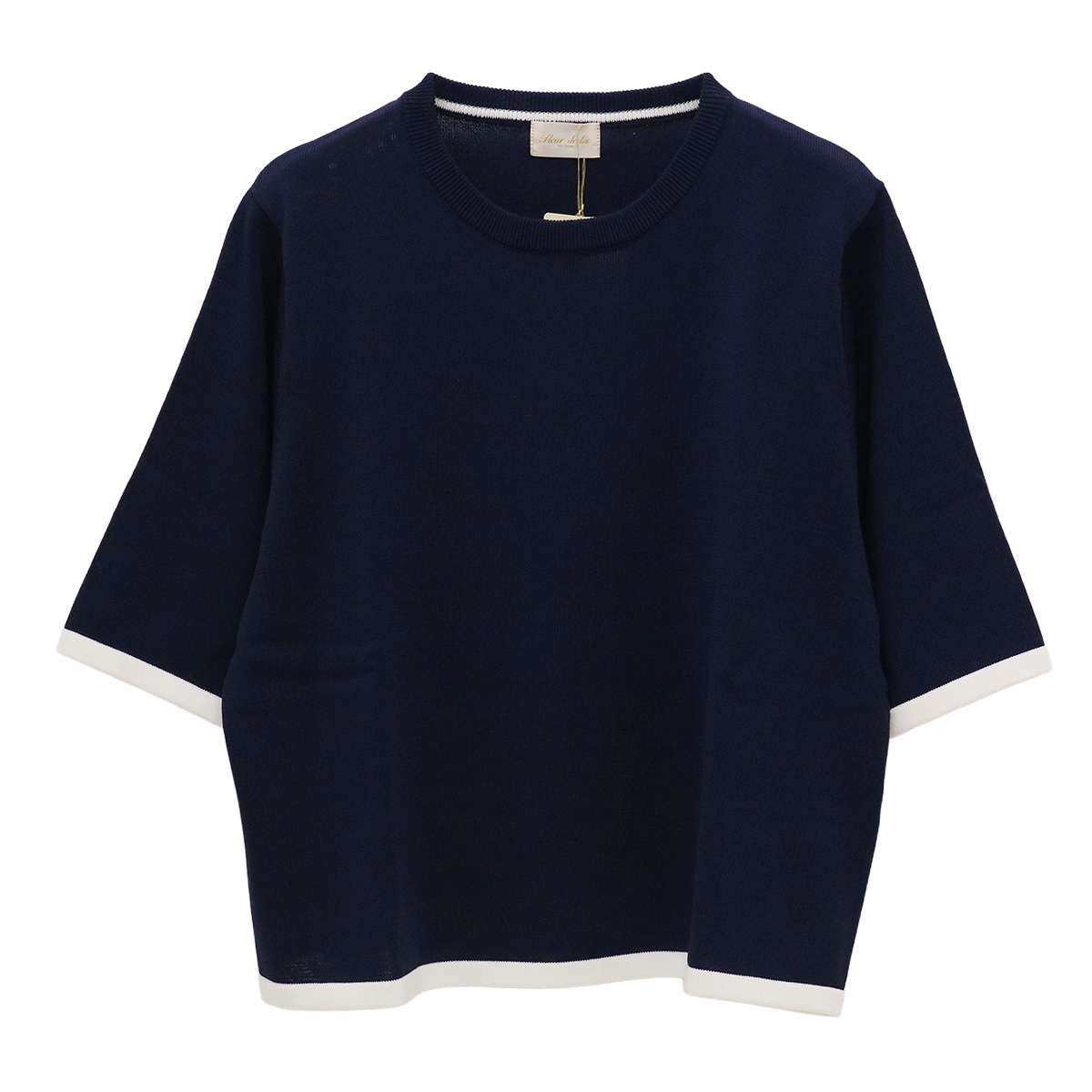 ショート丈クルーネック5分袖配色ニットトップス 91×01 ネイビー×ホワイト【Fleur de lis(フラデリ)】